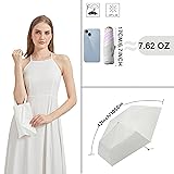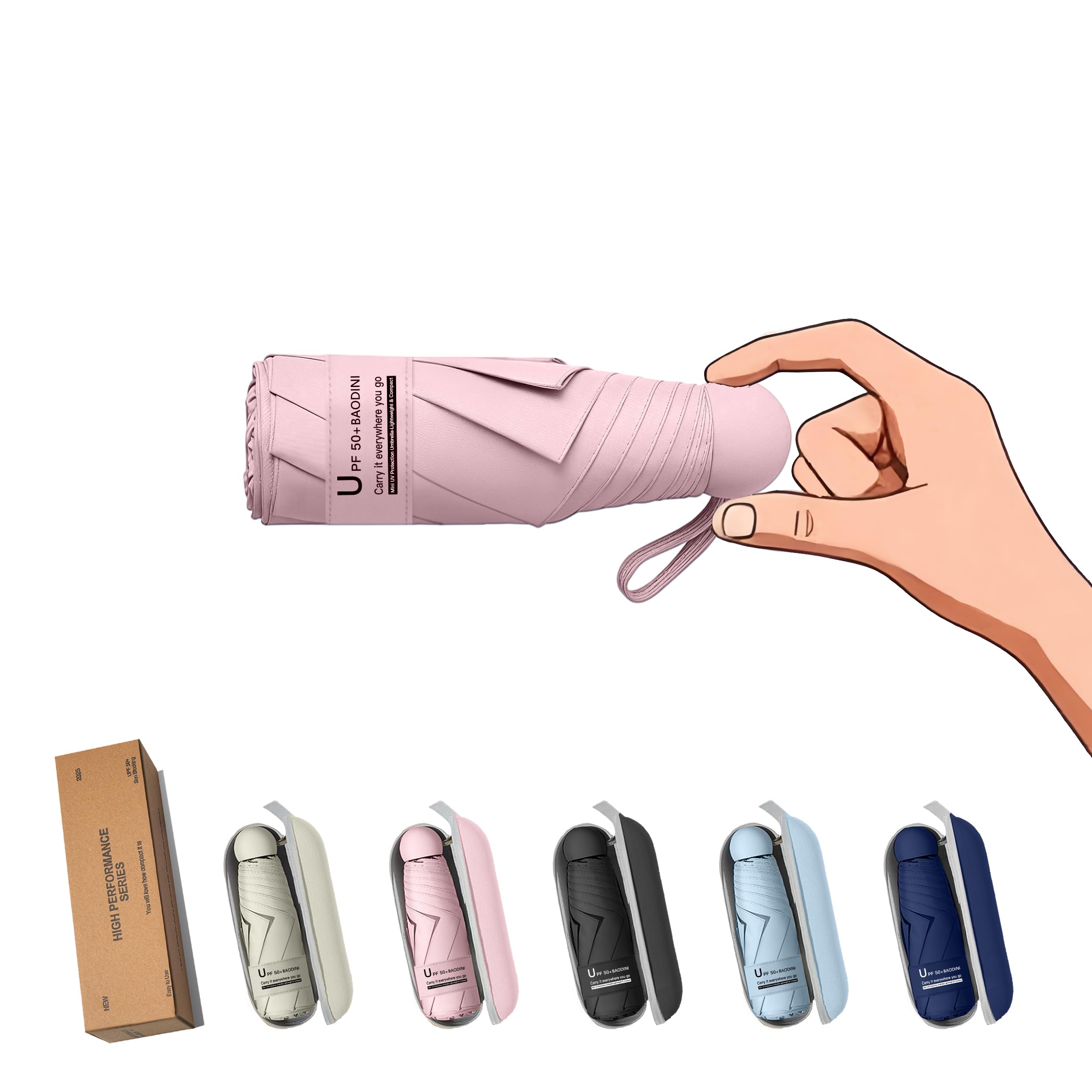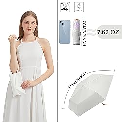 Small for One Person: It's folded length is 6.7 inches, about 1.5 inches longer than the palm of your hand, small enough for a pocket or your handbag, but it opened up big enough to protection you from sun and rain UV Protection Sun Blocking: This tiny umbrella can reach 99% UV ray protection with a UPF rating of 50+, its canvas coating blocks a large proportion of the ultraviolet radiation emitted by the sun Aluminum Frame System: The build quality is obvious the minute you open it up, it is built to last, the frame is composed of high-grade fiberglass and aircraft-grade aluminum Come with a Handlebag and Case: Giving someone a a brightly colored umbrella as a gift can symbolize protection, care, and thoughtfulness, it may also be seen as a symbol of good luck Since it's a lightweight umbrella, we would not recommend using it when it's super windy, it is more sturdy than ordinary mini umbrellas, and a little longer, it stands out its bright color, aluminium shaft and compact size
