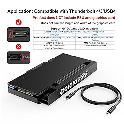 Application: eGPU dock is Compatible with NUC/ LAPTOP/Game machine with Thunderbolt 4/3/USB4 interface. (NOTE: It does NOT support with Thunderbolt 1/Thunderbolt 2 ports/type c interface products-check details in installation video or photo 5th about this.) Great Performance: Our portable GPU dock station built in the officially certified JHL7440 controller module, which used to break the 22Gbps limitation of JHL6 series and the neutering of JHL8 series PCIE X1,provides a stable and efficient expansion experience. For Windows system,Please install or update the latest version of the Windows 11 operating system. Power Supply: Works with ATX, SFX, FLEX and DC 12V power supplies. Supports PD charging (up to 85W). Please prepare the power supply according to the power of the PCIe card.(NOT INCLUDE DC 12V POWER ADAPTER IN PACKAGE). Daisy Chain Support: The port supports daisy chain for excellent performance. Enables 32Gbps data transfer with PCIE3.0X4. Function Well: Built with a 10Gbps USB A port, a TB4 port, a daisy chain port, which makes this external GPU docking station also as a hub, and can attach the external device as you need. Very Important NOTE: Do NOT insert CPU CABLE to the PCIE-8PIN port of the dock, it will cause automatic power-off protection, if you wrongly inserted it, please unplug it and then unplug the ATX-24PIN cable, and next insert the ATX-24PIN cable again to use it. NOTE: Please make sure your laptop or your device has a Thunderbolt 4 or Thunderbolt 3 or USB 4 Port, otherwise it can not be used. And package does not contain the ATX power and does not contain the graphics card.