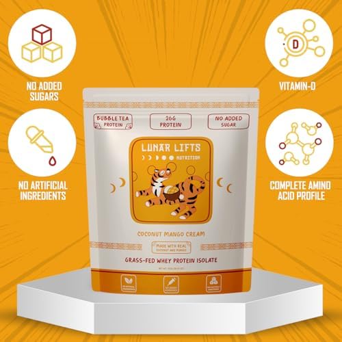 Lunar Lifts Nutrition Coconut Mango Cream - Boba Tea Whey Protein Isolate | 26 Grams Grass-fed Whey Isolate Protein per Serving Protein Powder | No Added Sugars or Artificial Ingredients Protein Shake