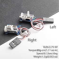 You will get two 1.5g mini servos (one left and one right) 1.5g weight: 1.5g net weight of servos, designed for ultra-miniature 3D flyers JR connector: customized JR connector, easy for your connection use Voltage: 3.7-6V Speed:0.12sec/deg