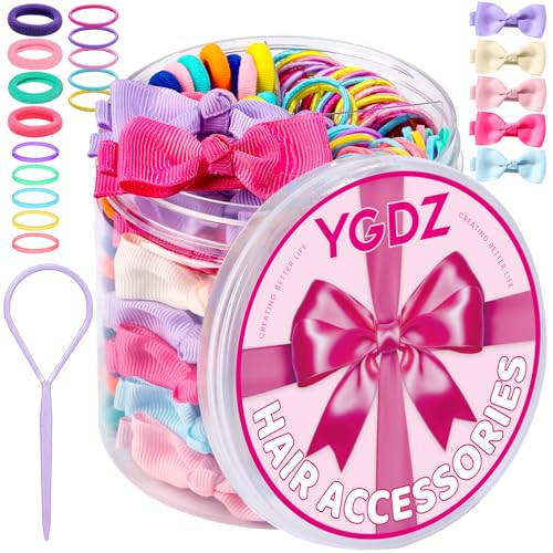 - HAIR ACCESSORIES FOR TODDLERS Looking for personalized hair accessories for kids? YGDZ HAIR ACCESSORIES are perfect girls gifts for any occasion. The set contains 3 different hair ties and 1 hair clips, suitable for various hairstyles. YGDZ hair accessories set includes 300pcs rubber bands for hair , 150pcs small kids hair ties, 100pcs cotton baby hair ties, 10pcs hair clips with bow, 1pcs mini hair loop tool. They are all packed in plastic box with dividers to separates the four types of accessories, perfect for styling little girls’ hair.