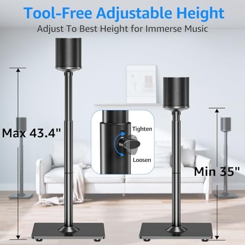 - Height Adjustment Speaker Stand: Elevate your audio experience with our 35" to 43.4" adjustable height speaker stand pair. Get your Sonos Era 100 speakers up closer to ear level for better surround sound instead of at the knee level. It also helps you free your speakers from a table or desk, and utilize the space. It's perfect for building a home theater.