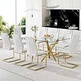 Glass Dining Table Set for 8:The modern glass dining table set for 8 showcases a minimalist style while perfectly blending practicality and comfort. This dining room table set with 8 white chairs will bring a better dining experience Large Kitchen Table with 8 Chairs:The size of the table is 71 '' L * 35.4 '' W * 30 '' H, and the size of the chair is 16 '' L * 19 '' W * 38 '' H. This dining table and chairs set can accommodate 6-8 person for dining. The table will be packed in two boxes and the chairs will be packed in two boxes Modern Dining Room Table Set:High quality tempered glass and gold metal dining table legs. The thickened glass tabletop can reach a thickness of 0.39-inch, and the adjustable height anti slip bottom corners, make this table sturdy and stable, with a maximum load capacity of 500 pounds to meet dining and daily needs Faux Leather Chairs set of 8:Ergonomic dining chairs are made of the comfortable soft bag and a sturdy metal frame, High-quality PU leather and metal frame also make this dining chair more durable. This dining chairs set of 8 will bring you a different dining experience Easy To Clean and Assemble:This kitchen table and chairs set are very easy to clean and only requires regular wiping to maintain cleanliness. The dining room table and chairs are also easy to install, and all tools and parts are individually packaged, so you don't need additional tools to install this set of dining table and chairs