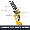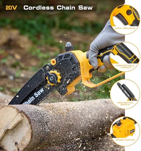 - SAFETY DESIGN: 8-inch mini chainsaw cordless has added a safety lock switch and splash guard. To prevent accidental starting, the safety lock and trigger must be pressed simultaneously to start the saw. Anti-splash baffle prevents wood chips from splashing during work.