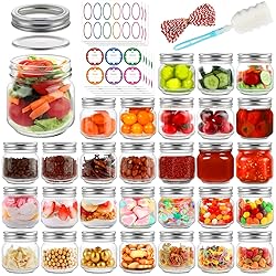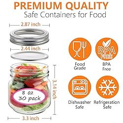 Food Grade Glass: The 8 oz mason jars with lids are made of high-quality food-grade glass, BPA-free and lead-free, with no issue re-using. Their high visibility allows you to see the content inside easily. Note: Dishwasher Safe & Microwave Safe (without the lid), Refrigerator Safe. Sealing & Leak Proof: Each 1/2 pint jar has a solid screw seal band and a flat metal disc with a leak-proof adhesive layer, preventing air and excessive moisture in. The split-type design can create a good sealing environment to keep fresh for longer. No worry about leakage or spills! Food Storage & DIY: These clear short mason jars are perfect for canning, pickling, and storing food like honey, jam, jelly, sauce, nuts, overnight oats, dry powder spices, herbs, vegetables, fruits, and more. They also can be great DIY projects with homemade candles, lights, or candy as wedding favors, shower favors, or other holiday gifts. Compact Small Jars: With the compact size, these small mason jars are perfect for food sub-packages and sharing with your family and friends. They do not take up too much room but make your home and kitchen neater. Package Includes: The set comes with 30pcs 8oz empty glass mason jars with silver split-type lids, 72 labels to mark, 1 sponge brush to clean, and 1 bundle of string for decor. All of them are packaged carefully in a foam tray to keep them far from damaging and cracking. If they still get broken, please feel free to contact us.