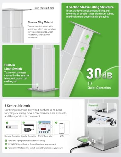 - Sturdy 3-Section Telescopic Design with High Load Capacity:Built with oxidized aluminum alloy and iron panels, this sturdy electric lifting platform offers exceptional durability. The 3-section telescopic design provides a wide height adjustment range from 14.6 inches to 30.1 inches. Pre-drilled holes on the top and bottom plates allow for easy DIY installation, enabling tons of custom uses as versatile adjustable table legs.
