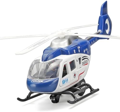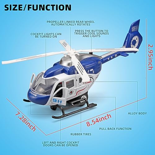 - 【Multifunctional Plane Toys】Our helicopter toys feature cool simulated sound and light effects.When the switch is pressed, the acousto-optic effect will be triggered, and the cab lights will light up and have simulated sound effects.Airplane cockpit door can be opened,landing wheel with pull back function.When you place it on a flat surface, pull it back and let go, it will move forward for a certain distance, and moving forward will drive the propeller to rotate.