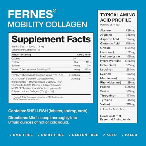 Experience the transformative power of Fernes Mobility Collagen Peptides, designed for both women and men. Each scoop delivers 10g of bioavailable hydrolyzed collagen protein powder, enhanced with Acti-Joint, a joint care complex featuring glucosamine, 100% pure pharmaceutical-grade chondroitin, and hyaluronic acid to nourish cartilage, strengthen subchondral bone, and improve joint lubrication. Also enriched with Liposomal PureWay-C, a clinically studied vitamin C for superior absorption, supporting collagen production and connective tissue health.* Ideal for paleo and keto diets, this gluten-free, soy-free, and dairy-free supplement integrates seamlessly into your daily routine. With a low molecular size of 2000 DA for rapid absorption, our scientifically-backed, unflavored collagen peptides are easily digestible and rich in 18 amino acids to support joint mobility, recovery, and overall wellness. Choose Fernes for your daily dose of strength, comfort, and vitality.*