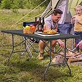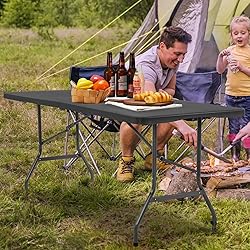 DURABLE CONSTRUCTION: Built with an insulated steel frame and heavy-duty plastic top, this folding table supports up to 350 lbs and folds compactly for easy transport and storage. VERSATILE DESIGN: Measuring 70.9x29.1 inches when open and folding in half for simple carrying, this portable table is perfect for indoor and outdoor use at parties, picnics, camping, and more. COOL TOUCH SURFACE: The smooth plastic desktop allows hold steady to keep drinks and food from getting topple over, while remaining sturdy and easy to clean. CARRY ANYWHERE: Portable plastic dining table carrying handle is included to take this 6 foot folding table anywhere needed. Simply fold, place in a bag, and go. OUTDOOR AND INDOOR: With its weather-resistant plastic top and black powder-coated steel frame, this versatile table can be used in any setting from the backyard to the garage to the living room.