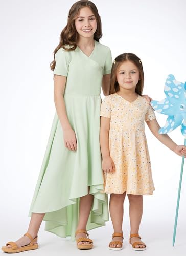 From eye-catching evening dresses and versatile day-to-day pieces to children's outfits and home accessories, our pattern catalog offers something for every style and body type. Ballet style front wrap dresses have circle skirt, narrow hem, and sleeve variations. View C dress has a high-low skirt. Fabric Suggestion: Stretch Knits only such as Cotton Knits, Interlock, Jerseys, Performance Knits. See Stretch Gauge. Interfacing: Fusible Knit. McCall's sewing pattern kits come with pattern pieces for cutting out the fabric, step by step written and illustrated instructions to guide you through the sewing process, and information on how to select fabric and trims plus sizing information. These clothing patterns can be made to fit children's sizes 3-4-5-6. Proudly designed and printed in the U.S.A.