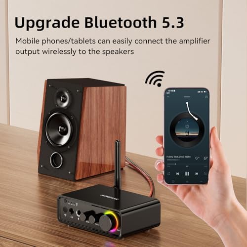 - 【Bass and Treble Controls】: The stereo amplifier is tailor-made for audiophiles who are in pursuit of superior hi-fi sound quality. Using the bass and treble control knobs, you can set the desired music output according to your own wishes, fun and playable. Comes with a remote control for long-distance sound adjustment. With RGB cool phantom color lighting design, moving with the music melody, full of ambient feeling