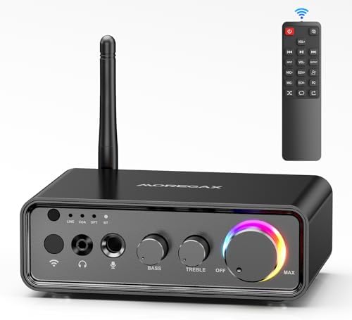 - 【Richer Interface】: MOREGAX Mini Bluetooth Amplifier Home Audio provides Bluetooth, Optical, Coaxial and RCA inputs as well as passive speakers, 3.5 mm AUX outputs, which can be connected to passive and active speakers at the same time, and supports 6.5 mm microphone jacks. Ideal for home theater speaker systems, can drive most home passive/active/bookshelf/ceiling speakers