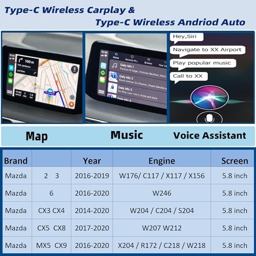 - 【Support Wireless Carplay No Android Auto 】The Wireless Type-C Mazda Apple Carplay Retrofit Kit, No need to connect your iPhone with one data cable. Note: The version only supports wireless Carplay No Android Auto.