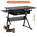 - Features: Height Adjustable: Effortlessly adjust the tabletop height to your preferred level, ensuring ergonomic comfort for prolonged use. Transition seamlessly between sitting and standing positions to maintain optimal posture and focus throughout your creative process. Tiltable Tabletop: The spacious tabletop boasts tilting functionality, allowing you to customize the angle from flat to a maximum of 45 degrees. Find the perfect incline for your drawing, drafting, or writing tasks, enhancing precision and comfort as you work. Ample Workspace: With generous dimensions, this drafting table provides ample space for spreading out your materials and working on projects of various sizes. Accommodate your laptop, drawing pad, sketchbooks, and additional tools with ease, maximizing efficiency and creativity. Integrated Side Tray: Keep your supplies within arm's reach with the convenient side tray, perfect for storing pencils, brushes, paints, rulers, and other essential tools. Stay organized and focused as you immerse yourself in your artistic endeavors without the hassle of searching for misplaced items. Two Slide Drawers: Utilize the two slide drawers to neatly store your art supplies, stationery, or personal belongings, minimizing clutter and optimizing workspace organization. Access your materials effortlessly whenever inspiration strikes, enhancing workflow and productivity. Comfortable Stool: Included with the desk is a comfortable stool, ergonomically designed to support you during long hours of creative work. Sit back, relax, and let your creativity flow as you immerse yourself in your artistic projects with comfort and ease. Sturdy Construction: Crafted from high-quality materials, including a durable metal frame and sturdy engineered wood tabletop, this drafting table ensures stability, durability, and long-lasting performance. Enjoy a reliable workspace that withstands the demands of your creative pursuits. Specifications: Material: Metal Frame, Engineered Wood Tabletop Color: Black Dimensions (Table): [Provide dimensions for tabletop] Dimensions (Stool): 20.5*12" (H x Dia.) Drawer Exterior Size: approx. 12.4 x 18.8 x 3.9" (WxDxH) Pen Container Size: 3.9 x 3.5" (HxDia.) Item Weight: 52lbs Package Includes: 1 x Height Adjustable Drafting Table Art Desk, 1 x Stool, Instruction Manual