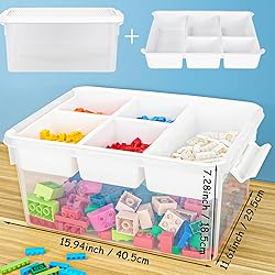 Spacious Capacity: Dimension: 15.91''L x 11.61'W x 7.28 "H. Capacity: 17quart. The interior has a divided removable tray for easy sorting items, and bottom space for larger ones. Craft box organizer keeps everything together and organized. Playable Baseplate Lid: Wonderful baseplate lid which makes the art supply storage organizer be a great play platform. Take out building blocks and build on the top at any time. Versatile Storage Containers: Perfect for organizing building blocks, Art supplies, craft items, sewing tools, jewelry, bead, coloring books, crayons, makers, playdoh, toys, etc. High Quality Materials: Made of safe and harmless plastic material PP5, lightweight, sturdy, and durable. Clear craft storage containers are easy to know what is inside and find things quickly. Secure Latch & Stackable: The sturdy latches open and close well, securely lock the lid of the craft box, prevent things from spilling out. Groove design makes the art bin stack well, you can put them anywhere, saving space.