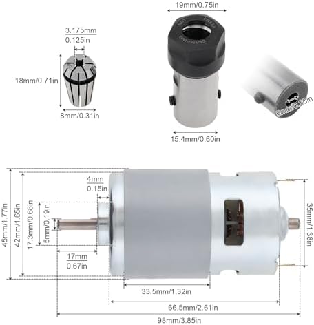 Material: Metal Product Name: CNC Spindle Motor Features: - High power, can engrave hard material. - DC 12-24V, 4000-8500RPM. - Compatible with 3018-Pro / 3018Pro-M CNC Router Machine. - ER11 Tail hole 5mm, 3.175mm accuracy clamp connecting rod connecting shaft. - Suitable for lathes, mills, car hoists, pumps and conveyors, etc. Note: - After installing the spindle to the fixture, make sure the screws are fixed. - Wiring: Red connects to the positive pole, and black connects to the negative pole. If the wiring is reversed, the motor will rotate in the opposite direction. - Overload: Keep the motor is within the specified load range as far as possible. - Don't block the motor or keep it run in a stall status for a long time. Otherwise, the motor will burn out. Package Include: 1 x 775 Spindle Motor Kit