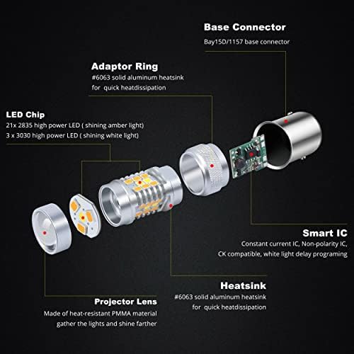 - Dual-Color LED switchback bulbs: 6000K Xenon White for parking light/daytime running driving light(DRL)/front side marker lights, Amber Yellow for Turn signal lights, brightest in the market.