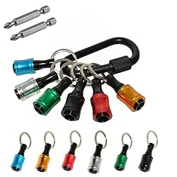 - [Function] --- Bits hold/quick change, The Pull-out bushing bits holder can instead of carting around large boxes that bits commonly come in. To make it easy to remove and place back on the quick connect. Can avoid accidental dropping of tools and facilitate high-altitude operations. [Application] --- Universal 1/4 inch quick hex shank and 1/4 inch hex socket keep different commonly used 1/4 bits handy. Fit most electric drivers, hand-held drivers and bits, like t25 and t20 bits etc. Make sure this fits by entering your model number. [Large Load] --- The powerful ball lock buckle of bits holder can carry bits tools up to 500g in weight. To keep the drill bits not easy to fall. [Keychain Bit Holder] --- 6PCS Extension Bar comes with a keychain buckle, which can be easily to install on chain buckles. Compact and portable, easy to carry around. [Durable] The drill bit socket adapters are made of aluminum alloy, nice durability, lightweight, sturdy, which ensure their longevity. [Higher Efficiency] --- Thanks to the smooth surface processing and pull-out bushing, can avoid accidental dropping of tools and facilitate high-altitude operations. It can be fitted with a short bit or a long bit. [Easy to Use] --- Keychain has a flat, thick and round design, which makes it easier to take the Extension Bar and change the bit with one hand. › See more product details