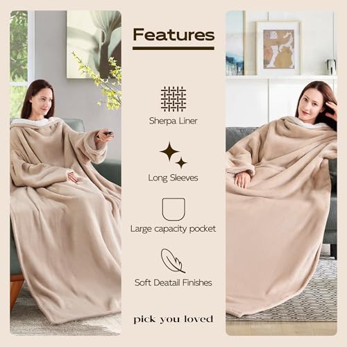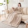 Wearable Blanket with Sleeves, Cozy Wearable Blanket with Arms and Pockets for Women Men, Warm TV Wrap Throw Blanket Robe as Gifts for Mom Wife, Camel