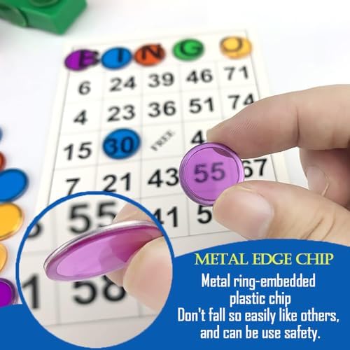 - Upgraded Bingo Chips - Durable and reusable semi-transparent plastic with a reinforced metal ring embedded, never loosening or falling off the chip. Each chip has a silver metal ring inside to be attracted and collected by a magnetic wand