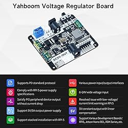 【Supports Pi5 power supply protocol】The robot regulated power supply expansion board supports the Pi5 power supply protocol, which can provide 5V/5A power supply to the Pi 5, effectively avoiding the low voltage and USB port current limit warnings of the Pi 5. Ensure sufficient current is provided to USB peripherals to avoid abnormal situations such as freezing and restarting, and unleash the full performance of Raspberry Pi 5. 【Powerful power supply compatibility】6~24V wide voltage input, 5V/5A stable output. Requires regulated 5V power supply equipment: such as RaspberryPi, Jetson Nano, Arduino, STM32 development board, etc. Additional self-purchased cables are required to connect Arduino and STM32. 【Power supply output mode】The robot regulated power supply expansion board has flexible input voltage adaptation and stable output characteristics. It can intelligently adjust the output current according to different input voltages to ensure that it provides 5V/3A output when the input is 6V, and 5V/3A when the input is 7V. Provides higher 5V/5A output when input to 24V to meet the power supply needs of different devices. 【Comes with dual Type-C power supply adapter boards】Pi5 uses dual Type-C power supply adapter boards to directly connect to the regulated power supply expansion board. The power supply adapter board supports the PD protocol to meet the power transmission needs of Pi 5. Effectively reduce cable redundancy. It also supports Pi5 stacking installation, which is not only suitable for Pi 5, but also compatible with the stacking use of Pi4B and other motherboards. 【Application Scenario】It can provide mobile power supply for various types of Raspberry Pi 5 robots. It has a safe and stable power supply system, with on-board input anti-reverse protection, output over-current protection, current-limiting protection, over-voltage protection, and over-temperature protection. Yahboom provides technical support, please contact us if you have any questions.