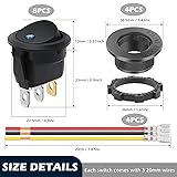 Round Switches Design: Toggle switches with a circular design, made of plastic and copper, It has good electrical conductivity and is resistant to high temperature, corrosion, has a longer service life. Switch Blue Indicator: This round on and off switch equipped with a blue light design, when you turn on the rocker switch, the light will also light up at the same time to indicate the working status of the device, is easy to see in the dark or bad weather. Size and Generous Quantity: 8 x Round on off switch(Diameter 22mm), 4 x black shell(Diameter 35mm), 8 x Red wires(Length20cm), 8 x Black wires(Length20cm), 8 x Black yellow(Length20cm) Easy to Install Use: This is a electrical switch set, 3-pin switch design, each wire has an internal slot for easy installation and removal without damage (round rocker switch rating: DC 12V 20A),these 3-pin switches can be installed on 0.9-inch (20mm) cutting size panels, which is convenient for the replacement and installation of equipment switches. Widely Used: We provide electric switch on off Cars, UTV, Wranglers, RVs, off-road vehicles, trucks, boats, water dispensers, treadmills, electric cars, and other household appliances can be used for modification
