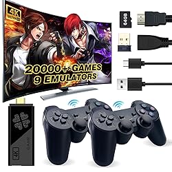 - Classic Gaming Reimagined:Step into the world of timeless gaming nostalgia with our exceptional Wireless Retro Game Stick! This video retro game console is a true gem for any gaming enthusiast, offering a thrilling array of features. With 9 emulators built-in, you'll have access to a staggering collection of over 20,000 classic games, guaranteeing endless hours of fun and exploration. Unlock Gaming's Golden Era:Equipped with a spacious (64GB) storage capacity, you'll never run out of space for your favorite games. The 4K HDMI output delivers an immersive and crisp gaming experience, breathing new life into your beloved classics. Plus, the included dual 2.4G wireless controllers ensure that you can enjoy multiplayer gaming with ease, whether you're competing or cooperating with friends and family. Unleash Nostalgia:What sets our retro game console apart is its user-friendly "plug and play" design. No need for complicated setup processes; simply plug it in, and you're ready to embark on a gaming adventure. The compact and sleek design makes it a seamless addition to any entertainment setup, and its portability means you can relive the golden age of gaming wherever you choose. Timeless Gaming Nostalgia: Rediscover the thrill of gaming with our Wireless Retro Game Stick. It's not just a console; it's a time machine that transports you back to the arcade glory days. Whether you're a seasoned gamer or introducing a new generation to the classics, this console is your gateway to countless hours of joy. Elevate your gaming experience, unleash your inner competitor, and create lasting memories with this all-in-one retro game console. Welcome to the ultimate gaming paradise!