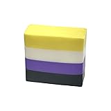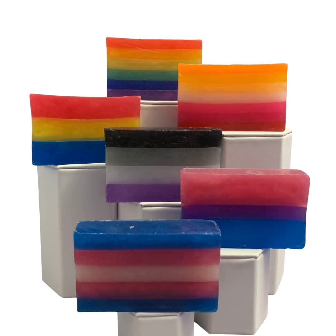 - Non-binary flag soap. Fresh and uplifting soap, shaped like the non-binary pride rainbow flag. Great for sensitive and dry skin. Scent of lemongrass and verbena. Creates a thick and creamy foam. Shea butter, Argan oil, Aloe Vera, Coconut oil, Calendula extract, Honey, Carrageenan extract, Marshmallow root, water, Non-GMO palm oil, glycerine, Sunflower extract, Stearic acid, Sorbitol Sodium, Kokum butter, Silk protein, Mica, Propylene Glycol, Sodium Hydroxide (lye), Laurie Acid, Amber fragrance oil. Active Charcoal, .Essential oils of lemongrass and verbena. Approx 5oz Hand cut. Handmade in La Quinta. CA. USA Do not use if you are sensitive or allergic to any of the ingredients. Can contain traces of nuts. Soap is handmade in the same location as the soaps with nuts.