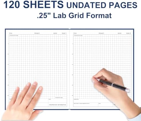 PROFESSIONAL DESIGN - Each page features 1/4 grid and signature blocks. Pages printed front and back, perfect for precise drawings and detailed notes.PREMIUM PAPER - This engineering notebook with thick 100gsm acid-free paper, ensuring your notes are preserved without fading or yellowing over time and prevent ink bleed-through. DURABLE COVER - The hardcover design ensures your notebook can withstand daily use and transport. Sturdy case-bound binding allows the notebook to lay flat, making it easy to write and view.FEATURES - 8" x 10"|User Data|Documentation Guidelines|Table of Contents|Project Pages|.LARGE CAPACITY - Contains 120 pages, providing ample space for all your important notes. Whether you are an engineer, student, researcher, or inventor, our high-quality engineering notebook is the perfect choice for recording and organizing critical information.