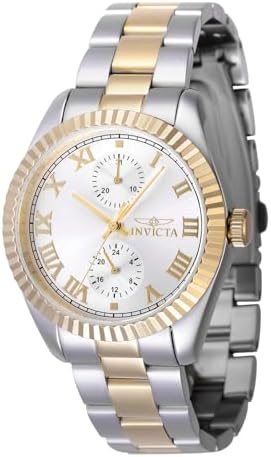 Silver-tone dial enhanced by gold-tone hands. Silver-tone stainless steel case with a two-tone (gold and silver-tone) stainless steel band. Quartz movement. 50 meters / 165 feet water resistance. Fixed bezel. Scratch Resistant Mineral crystal. Solid caseback. Fold over push button clasp. Pull / Push crown. Case size 36 mm x 10.00 mm. Band 18 mm x 6.50 incheslong. Invicta 47440 Specialty Watch.