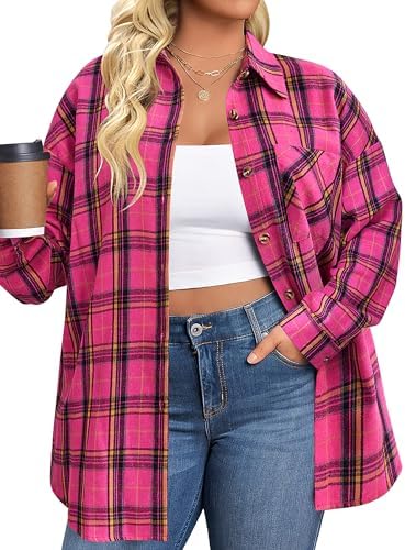 IN'VOLAND Womens Plus Size Flannel Plaid Shirts Long Sleeve Casual Collared Button Down Shirt Loose Blouse Top Pink
