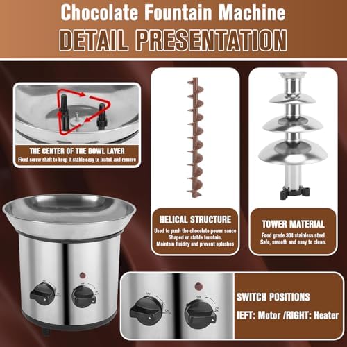 - 【Spiral Layered Design】 Spiral layering creates a beautiful cascading effect and prevents splatter. Fountain chocolate machine perfect for parties, weddings, and gatherings, it creates a mesmerizing flow of chocolate, cheese, or sauce, adding a touch of sophistication to any occasion. Package includes: 1x 4 Layers chocolate fountain, 4x Stainless steel fork, 1x Instruction manual.