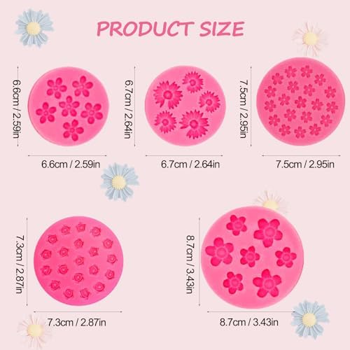 Llchunyun 5Pcs Flower Candy Silicone Molds Rose Chocolate Molds Small Flower Fondant Molds Polymer Clay Resin Mold for Baking Candy Molds for Wedding Cake Decoration Ice Cube Soap Wax Mold for DIY Craft PACKAGE INCLUDED Our flower ice mold includes 5 pieces of pink flower silicone molds, our flower silicone molds are made of food-grade silicone, safe and odorless,easy to use and cleaning, whether it is a good choice for bakery or home use! 【Item Details】 Material: Food-Grade silicone These silicone flower molds made of Food grade silicone our rose molds are Flexible and Non-stick, BPA Free, very practicality and durability. Our candy molds for ice can be reusable, innovative design, soft, and stripping easy. our flower silicone molds for baking turn out gorgeous chocolate every time, also great gift ideas. Easy to clean up, heat resistant from -104℉ to 446℉, can be used for microwave, oven, refrigerator, freezer and dishwasher.Simply pour your favorite recipe in the mold, After cool completely, then turn it upside down, pop right out with a little push from the bottom. Remember to place the rose flower silicone mold on a tray ,for easier positioning and removal. Each package includes 5pcs of flower ice mold. You can create your own special desserts, homemade soaps, Candles, Cake, Jelly, ice cubes, Pudding, Chocolate, party favors and more. 💛Thank you for choosing our goods! Warm notes: 1 The colors may exist slight difference due to different screens. 2 Manual measurement, please allow slight errors on size.