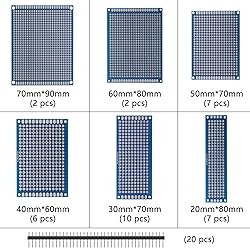 Widely used in electronic experiments and point-to-point DIY IoT projects. 6 different size boards to meet your demands when designing your kits, electronic experiments and DIY projects PCB Board Prototype Kit for Electronic Projects, Circuit Solder Double-Side Board Using high-quality and durable glass fiber FR-4, high-quality and firm. with 4 mounting holes at the corners of the board are very convenient for installing them together. with 20pcs 40P 2.54mm Pitch Single Row Pin Header Strip 40Pin 2.54mm Pitch The product contains six different sizes of circuit boards of circuit boards 7PCS 2*8,10PCS 3*7,6PCS 4*6,7PCS 5*7, 2PCS 6*8, 2PCS 7*9
