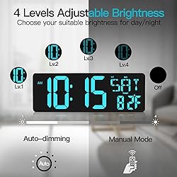 17.2" Extra Large LED Display ---- 4.84 inch High contrast clear jumbo digits make it much easier to read from anywhere in the room. This large digital wall clock can show the time, date, month, day and temperature, bring you clear and comfortable visual sense. Great choice for home decor, office, classroom, gym, hospital, shop, garage, seniors & the visually impaired. Auto/Manual Adjustable Brightness ---- Featuring a 4-level adjustable brightness display, you can easily adjust manually to a comfortable brightness by using the remote control, allowing you to have this in the bedroom and sleep without disturbing glare. The LED wall clock also can auto adjust brightness as the light changes, it will not be too bright at night. Also, you can turn it off if needed. Multifunction Digital Timer Clock ---- This large display timer clock has has 3 modes: Timer, Alarm Clock, Clock. You can just press mode button to change mode, easy to operate. User-friendly design, 12 or 24 Hour display formats with indoor temperature display in ℃ or ℉, meet your various needs. In addition, it comes with a battery backup (2 AAA) in case of loss of power. Count Up/Down Timer with Handy Remote Control ---- Remote control helps you to easily set the digital wall clock. The distance is up to about 32ft. Available timing period of this digital timer clock is for 0-29 hr 59 min 59 sec. There will be 90 sec DIDI ringing when countdown ends. Because of the memory function, the timer can remember your last setting if you did not turn it off. Perfect for kitchen cooking, beauty, exercise, classroom teaching and kids time management. Wall Clock & Desk Clock with a Power Plug ----- The wall mounted clock has a power plug so you don't have to change batteries often, two keyholes for easy wall mounting and a fold-out backstand for tabletop or shelf placement. It is easy to set up, you can easily set up clock with buttons on the device or remote control.