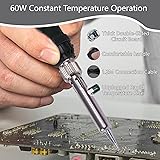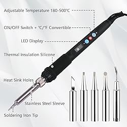 【60W Electric Soldering Iron Kit】 The 220V 60W electric soldering iron supports temperatures between 180 ℃ and 500 ℃. It has a ceramic heating core, which not only rapidly heats up but also has intelligent constant temperature control function. 【Efficient Work】 Soldering iron is equipped with an LED digital display screen, which can quickly adjust the appropriate temperature through the "+" and "-" buttons, helping you accurately and flexibly control the temperature, improve work efficiency, and achieve ideal results. 【Insulation】 The handle sheath is made of insulation silicone material, which is resistant to high temperatures, soft and comfortable, and prevents slipping, ensuring your safety during use. 【Environmentally soldering iron tip】 stainless steel sleeve and lead-free soldering iron tip, with good tin plating effect, oxidation resistance, long service life. Equipped with silicone sleeve, it is easy to store and store when idle. 【Rich set】 You will receive 1 electric soldering pen, 5 welding heads, and 7 M2 M2.5 M3 M4 M5 M6 M8 heat set insert tips of different lengths, with a variety of sizes to meet all your welding needs.