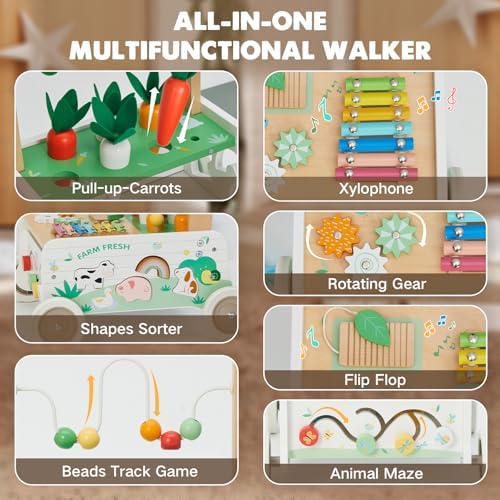 Wooden Baby Walker, Baby Push Walker, Adjustable Speed Baby Walker with Wheel, Toddler Activity Center Toys, Montessori Farm Walker Toy with Shape Sorter, Carrot Harvest for Boys and Girls