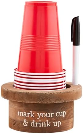 The Disposable Cup & Marker Set is a convenient and fun 3-piece set that includes ten plastic party cups and a permanent marker. The cups are neatly organized in a wooden base with a designated spot to hold the marker. Each cup has a capacity of 18 ounces and the base measures 3" x 5 1/2" in diameter. Perfect for parties and gatherings, this set allows guests to personalize their cups with the marker, ensuring that they can easily identify their drink. After the event, simply dispose of the cups for easy cleanup. Enjoy a personalized and hassle-free drinking experience with this Disposable Cup & Marker Set.