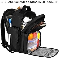 Insulated Lunch Box Compartment: MATEIN 15.6 inch lunch backpack for men not only keeps the food warm but also keeps cold drinks for about 2-4 hours, high quality insulation layer of lunch box compartment keeps food fresh and warm in this insulated cooler backpack, which makes it easy to clean and store food. Laptop backpack with cooler compartment is suitable for work, office, picnic, beach, trip, travel, outdoor&indoor. Food container compartment dimension: 11*5.3*9.5 inch Storage Capacity & Organized Pockets: Dimension: 18*11*11 inches, mens work backpack 15.6 inch with an extra-large main compartment, laptop compartment and many pockets. 2 side zipper pockets for easy access to tissue, conveniently hold umbrellas and water bottles. The front pocket can hang the key for commuting. Top compartment stores glasses. Laptop backpack for men provides independent space for your laptop, mobile phone, clothes, lunch box, wallet, keys Laptop Compartment & USB Port: MATEIN backpack lunch bag for men with a separate compartment is fully open design for 15.6 Inch laptops as well as 15 Inch computers and tablets, TSA friendly design allows you to quickly pass the airport security check. And the USB charging port of this backpack for men makes it easy to charge your phone, convenient and practical, note not include the power bank Water Resistant & Convenient: Lunch backpack with lunch box is made of high quality water-resistant lightweight polyester fabric, high quality shoulder strap of the business backpack for men is designed with breathing durability fabric and comfortable U air vent back, adjustable straps lighten weight and protect your muscle, A luggage strap allows carry on travel backpack to slide over the luggage tube secure it in place. Hidden safety pocket of lunch box backpack is safe and convenient Sturdy & Multi-Purpose: This backpack cooler for men with comfort high quality polyester fabric materials ensure lasting use, the bottom fixed pad makes your work backpack sturdy. You can store survival gear kits and outdoor emergency tools in your rucksack backpack for camping, hunting, hiking. Travel backpack for men is ideal for sports, office and outdoor activities. Great travel gifts for travelers, working man, friends, men, women, adults, husband, father, grandfather