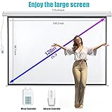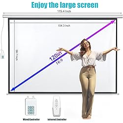 Size and Aspect Ratio: 120" diagonal, 16:9 view size: 104.8"W x 58.7"H. Suitable for LED, LCD, and DLP projectors. Electric Motorized Projector Screen: Prewired power cord with integrated switch to regulate drop/rise settings or radio frequency remote control for distant control. Premium PVC Matte White Screen: 160-degree large viewing angle provides a wide viewing area; 1.1 gain matte white screen is yellow-staining-free, wrinkle-free, and offers outstanding image reproduction. Easy Installation: The solid metal casing features a dual-purpose design for wall or ceiling installation, making this an ideal product for home, office, or classroom use. Versatile Viewing Experience: Perfect for home, schools, offices, weddings, church, or outdoor movie screenings; can be used for PowerPoint presentations and other displays. All-Round Support: Covers your item with professional care 24/7 and worry-free after-sales services whenever you contact us through Amazon Message Cente.