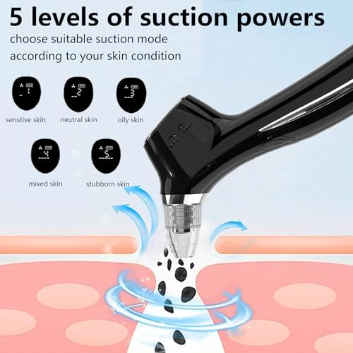- 【Facial pore cleansing tool】-The pore cleaner tool, a good blackhead remover for ears,nose,face,etc, is equipped with 5 kinds of suction heads which are suitable for facial hydro pore cleansing. You can choose multiple head sizes to get right suction according to your skin conditions.And it has five levels of suction powers which can be freely adjusted according to your skin type.In general, level 1 is suitable for sensitve skin, level 2-3 is suitable for dry and neutral skin, and level 4-5 is suitable for mixed and oily skin.