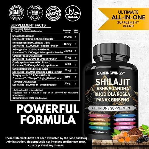 - ✅ Darkingwings Shilajit Capsules – An advanced shilajit 8 in 1 formula for women and men, Nature's Synergy Blend featuring shilajit pure, ashwagandha extract, ginkgo biloba, rhodiola rosea, panax ginseng extract, stinging nettle, cordyceps mushroom, and turmeric capsules; this ultimate blend of ashwagandha and shilajit supplements for men and shilajit supplements for women helps boost energy, stamina, focus, and overall vitality.