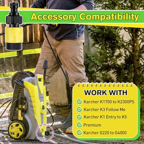 - Compatible with Karcher Pressure Washers: Includes multiple pressure washer adapters such as a garden hose connector, a threaded water inlet adapter, and an electric pressure washer quick connect. Fully compatible with Karcher K1700, K1800, K2000, K2300PS, K1 Entry, K3 Follow Me, K5 Premium, and G220 to G4000 gas pressure washers.