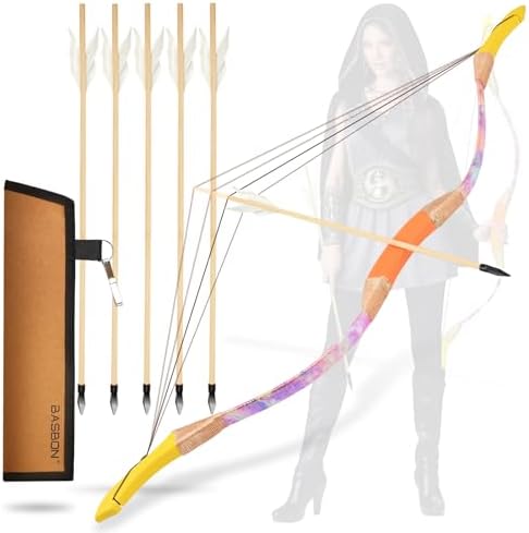 - The bow is made from solid wood and durable bamboo, and wrapped in microfiber leather, making it both attractive and durable. The bow itself measures approximately 40 inches long, the wooden feathered arrows measure approximately 21 inches long.