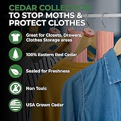 GREAT SMELLING. Our fragrant Cedar collection for closets provide that wonderful scent that’s been used for years in clothes closets to protect clothing and fabrics. ALL NATURAL, FAMILY AND PET SAFE - our cedar 61-piece variety pack is the all natural and easy way to get the benefits of cedar without the cost of a cedar closet. These great smelling cedar products are perfect for closets, drawers, garages, and even your car. NATURAL FRESH CEDAR: Sourced from select forests in the Eastern United States, these cedar planks, cedar balls, cedar rings, and cedar sachets are expertly crafted from Cedar heartwood for exceptional quality while providing a long-lasting scent JUMBO VARIETY PACK OF TOP CEDAR PRODUCTS use the natural power of Cedar to keep your valuable clothes safe including sweaters, dresses, pants, suits, scarves, and more. EASY TO USE: Simply place the Cedar products in your closets, drawers, cabinets and storage containers or hang the planks and sachets 6 inches apart using the provided sturdy hangers.