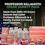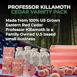 - Introducing Professor Killamoth Ultimate Cedar Collection Variety Pack! This 61 piece collection of our best selling cedar products includes cedar sachets, cedar planks with hangers, cedar rings, and cedar balls --- all with the powerful scent of cedarwood. Sourced from select forests in the Eastern United States, these fresh cedar products are expertly crafted from Cedar heartwood for exceptional quality while providing a long-lasting scent that’s easily renewed with a quick swipe of sand paper if desired. Preserve your favorite clothes and delicate fabrics by relying on the power of Professor Killamoth Ultimate Cedar Collection Variety Pack.
