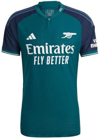 A nod to the archives with a classic Arsenal look. From its simple heat-applied cannon to the green and navy colorway, the Arsenal 23/24 Third Authentic Jersey represents a real blast from the Gunners' past. Cut for a slim fit, the mesh inserts enhance comfort while HEAT.RDY maximizes airflow so you can feel cool on the pitch. The ribbed henley collar and droptail hem finish the look in style. A minimum of 70% of this product is a blend of recycled and renewable materials.