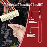 [Practical]: Our terminal removal tool kit is 0.8mm thick, which is more robust and durable than the standard 0.6mm tools on the market. The improved long handle design ensures a comfortable grip and effortless use. [86pes Set]: You will receive 86pcs electrical pin removal tool set, including 24 pieces of single pin extractors, 43 pieces of double pin extractors, 2 piece of triple pin extractor, 15 pieces of sleeving tools, and a protective pouch for easy storage and carrying. [EASY To Use]: Our wire terminal removal tool allows you to easily remove the terminals from the harness connector and add new wires without damaging the original harness. [Waterproof Protective Case]: The terminal ejector kit comes with a sharp-proof safety case to prevent child access and ensure safe storage when not in use. Its compact and lightweight design is easy to carry. [Wide App;ication]: Our terminal release tool kit is compatible with most connector terminals for automobiles, household appliances, and motorcycles, so it is suitable for a variety of applications, and this kit can meet your needs!