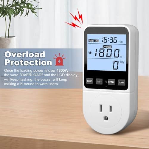 - Overload Protection: When the power of the appliance exceeds the overload power, the word "OVERLOAD" and the LCD display will keep flashing, the buzzer will keep making a bi sound to warn the users. All the buttons will quit working and can only work again when the overload alarm has been cleared by raising the setting value or removing the appliance. The default overload power is 3680W and is adjustable from 0 to 3680W. In general, you need to set the overload power to 1800W before using. Just press the "MODE" button for more than 3 seconds to enter the setting.