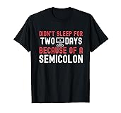 Ideal for software engineers, web developers, and coding enthusiasts. Featuring a humorous alien abduction design with "Didn't Sleep For Two Days Because of a Semicolon". Perfect for those who love programming, coding, and front-end development. Funny and unique graphic design for programmers specializing in server-side coding, databases, and APIs. A playful nod to the tech community, sure to be a hit at hackathons, tech meetups, or just casual coding sessions. Lightweight, Classic fit, Double-needle sleeve and bottom hem